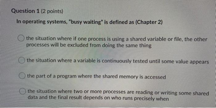 Busy waiting in operating system. Platform to practice programming problems. The repeated execution of a loop of code while waiting for an event to occur is called busy-waiting. Student to give two problems with busy waiting in general Operating Systems G53OPS - Examination Graham Kendall It wastes CPU resources by sitting in a tight loop waiting for an event to happen.
